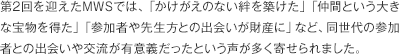 MWSは一生に一度ですが、一生の仲間が出来る場所でもあると思います。もし、興味のある方がおられたら参加してみてはいかがですか?まだ見ぬ仲間と出会うことができますよ。