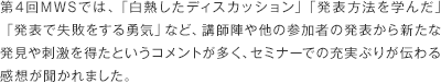 セミナーのはじめに上阪先生より過去の参加者の感想が述べられました。そのなかでとても印象に残ったのは、「残念なことを挙げるとすれば、このセミナーにはもう参加できないこと」とありました。ホントかよ??!と半ば他人事のように思えたそのフレーズが、MWSを終えた今では本当にそう思える日々だったと思います。